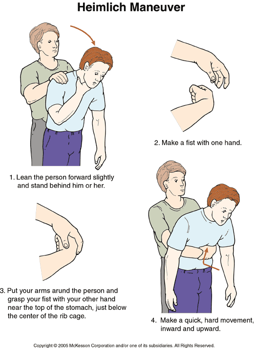– Choking  With all the great food, conversation and commotion going on it’s possible for someone especially kids and seniors to have a piece of food like a walnut or piece of candy go down the wrong pipe. Brush up on your Heimlich maneuver.  If you have young kids get them involved and have them demonstrate to your guests before dinner the universal sign for choking like a pre-flight safety demo.