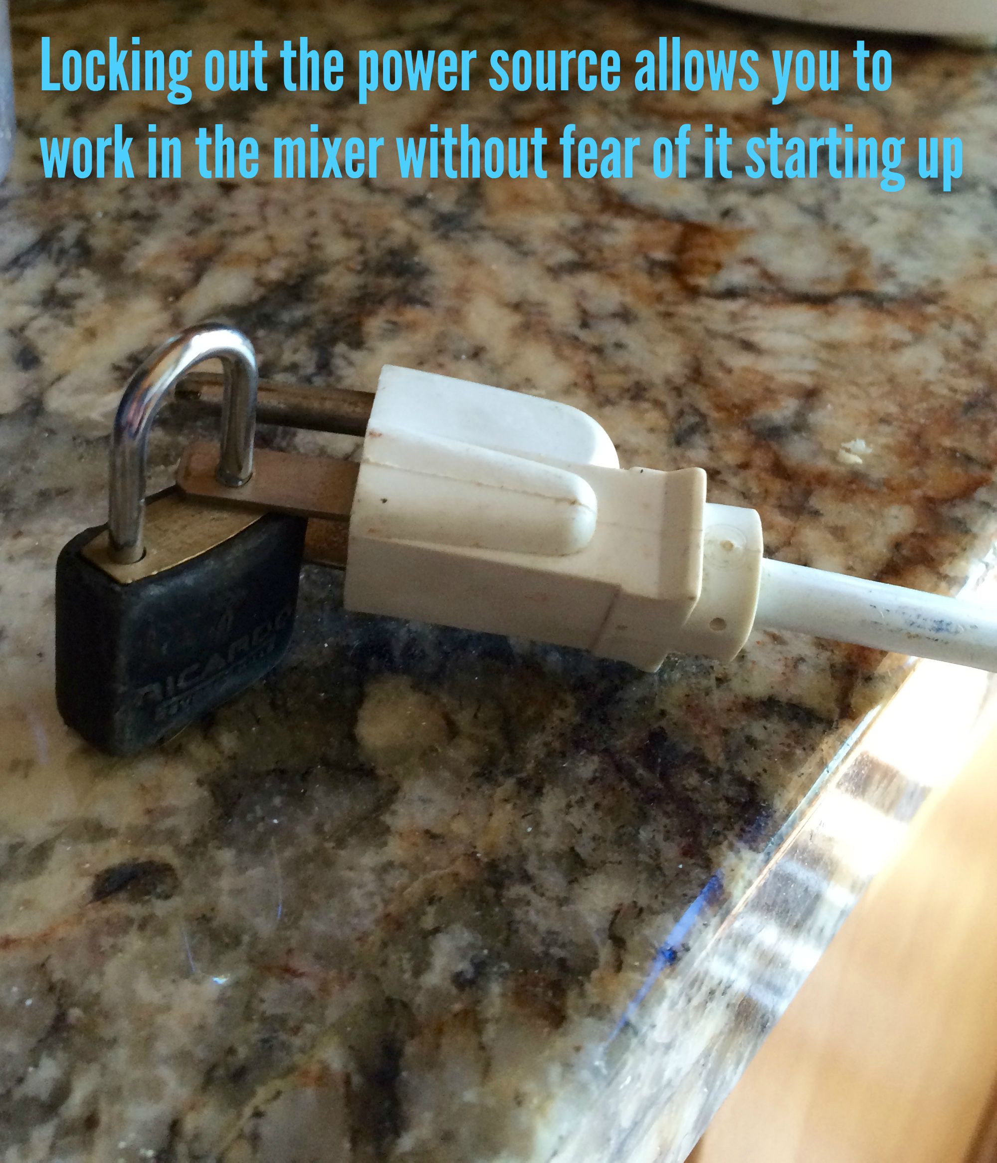 L.O.T.O. is not your state’s lottery. It stands for Lock Out Tag Out which means before you work on a piece of machinery, whether to clear a jam, make adjustments, or replace parts you lock out the power source to the equipment in question and then tag out so people know who is working on the equipment. For this lesson, the equipment we’re using is a kitchen mixer but the principal works for all types of machinery and equipment.