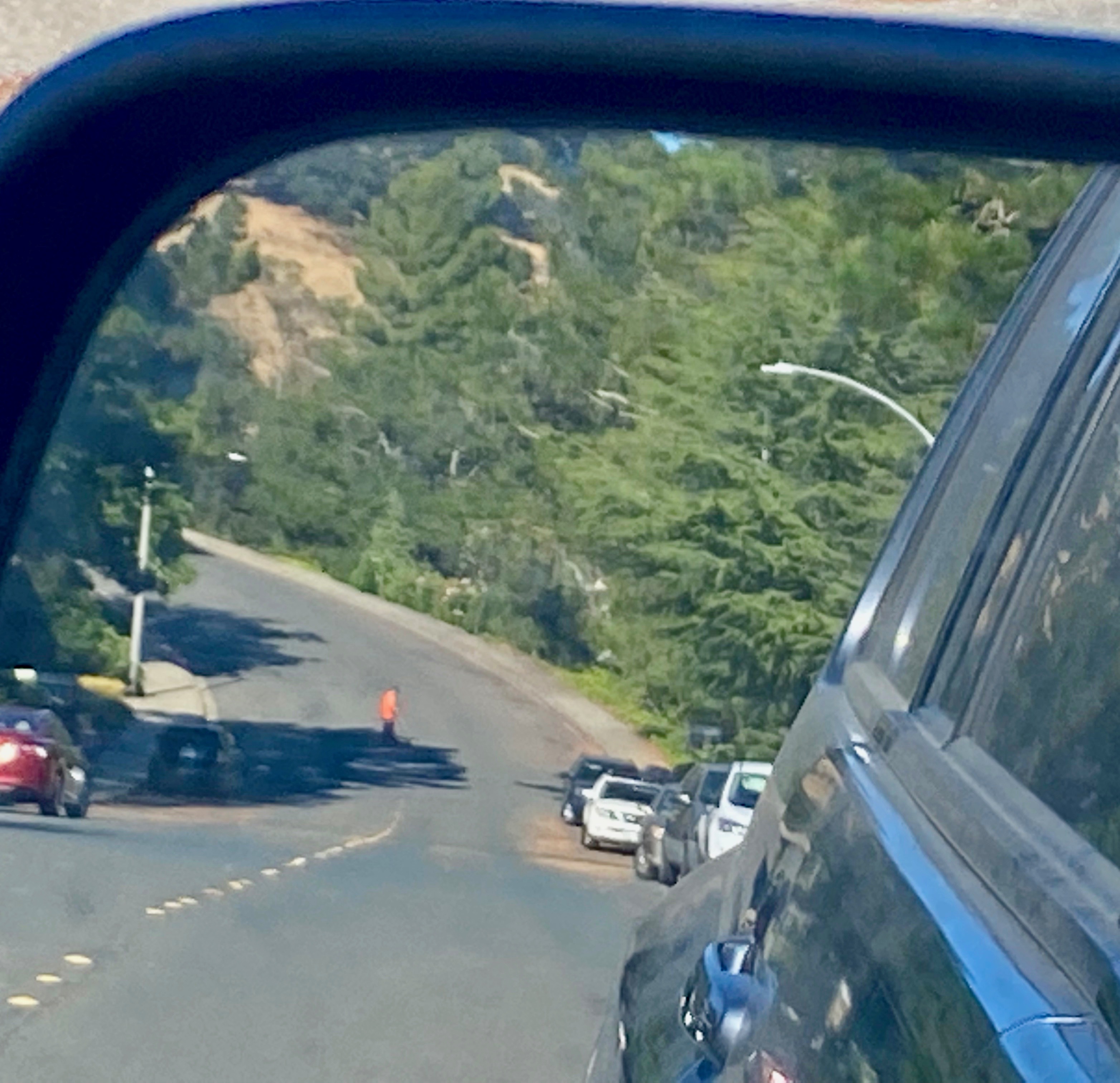 I wonder, did they not receive any safety training? Did their boss tell them to ignore their training and just do it quickly? Did the employee decide to take the shortcut on his own to get done quickly since they think their bosses don’t care? Is it their ego, nothing will happen to me, it hasn’t yet? Is it a combination of all these things? Why would you expose yourself to danger with the possibility of a lifetime of surgeries and rehabilitation, or worse, forever dead from inadvertent suicide just to save a few minutes? Is this fair to the driver coming down the hill who suddenly finds this living traffic cone in his way? By the way, people naturally come fast down this way with a blind turn at the top.
